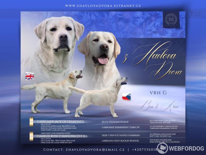 CHS z Havlova dvora nabízí žlutého, osm týdnů starého pejska, který už má batůžek s bohatou výbavičkou sbalený a do nového domova může odjet prakticky ihned. Oba rodiče i předci testovaní na dědičné choroby, dysplazie vše čisté. Otec ze země původu - Anglie, mamina linie USA, Mexiko, Anglie. Předpoklad pěkného exterieru, dobrého zdraví a charakteru. Labrador je skvělý a oddaný společník, ideální kamarád do rodiny, canisterapii, nebo práci. Uvítám trvalý kontakt s majiteli. Retrívry chovám od roku 2001 a díky mnohaletým zkušenostem poskytuji kvalifikovaný chovatelský servis. Najdete nás uprostřed ČR, nedaleko D1. www.zhavlovadvora.estranky.cz