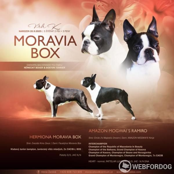 Chovatelská stanice s dlouholetou tradicí Moravia Box FCI nabízí nadějnou fenečku i pro výstavy a chov (není podmínkou) po špičkových rodičích.