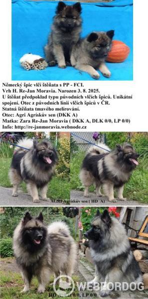 Německý špic vlčí / keeshond prodám krásná, statná štěňata kvalitní krve s PP. Štěňata z vrhu H. volní pejsci původního typu vlčího špice - ostražití, odolní hlídači domu a dvoru, nekompromisní ochránci rodiny a hrdí strážci domova milující a oddaní své rodině. Štěňata z vrhu CH. volná fenka v typu keeshond robustní, podsaditá, bohaté srsti, veselá. Čiperní psi milující rodinu, aktivní společníci i bystří hlídači domu a dvoru. Rodiče zdravotně vyšetřeni, vynikajících povah i exteriéru. Ideální ostražitý hlídač a společník do rodiny, na procházky, výlety jako společník. Velice líbiví, elegantní, impozantní, nenároční psi. Štěňata s PP - FCI, mikročipem, EU petpassportem, očkovaná, otužilá, zvyklá již být celodobě venku. Jsou to vynikající, ostražití hlídači domu a dvoru i milující, veselí rodinní psi, oddaní ochránci své rodiny. Vhodní k dětem i k zvířatům. Nejsou uštěkaní a nemají sklony k toulání. Mají bohatou srst, která není náročná na údržbu, samočistící, stačí občas vyčesat. Upřednostňuji tel. kontakt. Chov ani výstavy nejsou podmínkou. Ostrava http://re-janmoravia.webnode.cz