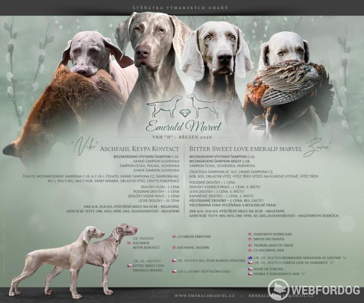 Matka štěňat je odchovaná v naší CHS – Bitter Sweet Love Emerald Marvel (ZARA) – mezinárodní šampionka a šampionka krásy několika zemí, vítězka plemene, vítězka třídy šampionů na klubové výstavě, aktivně využívaná v myslivecké praxi. Má složeny všechny typy loveckých zkoušek – podzimní, zkoušky vodní práce, lesní zkoušky, barvářské zkoušky a všestranné zkoušky – vše v I. ceně. Na BZ se umístila na 2. místě z 24 psů. Na VZ získala titul res. CACT. Má nadstandardní zdravotní vyšetření – vyšetření kyčlí a loktů, vyšetření srdce - vše s negativním výsledkem. Po rodičích je negativní na choroby postihující výmarské ohaře – DM, MH, HUU, HYM, SD, DAS.